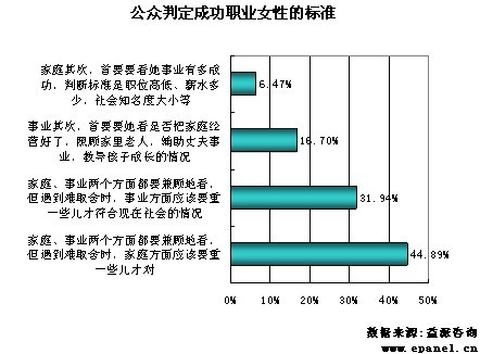 在判定成功职业女性的标准方面,较多的公众认为应从家庭、事业两个方面来评价一位女性的成功,能够兼顾两方面的女性更为值得尊重,而在遇到取舍的时候能够将家庭放在的前面的价值观得到最多人的认可。