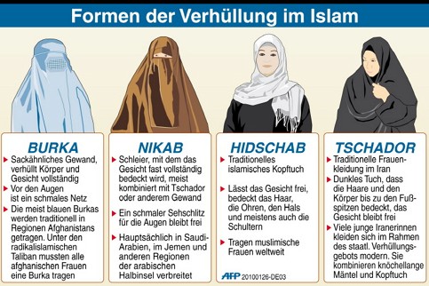 据《可兰经》的着装要求,妇女必须遮盖头部、颈部和胸部以保护其荣誉和尊严。但是关于佩戴的面纱也不尽相同,《世界报》就罗列出了以上四种基本面纱样式。