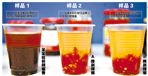 那么如何分辨辣椒酱的好坏?杨洁明表示,有一个简单的辨别方法,就是将辣椒酱用水稀释,静止一段时间后看有没有杂质沉淀,“没有沉淀就是有质量的保证”。
