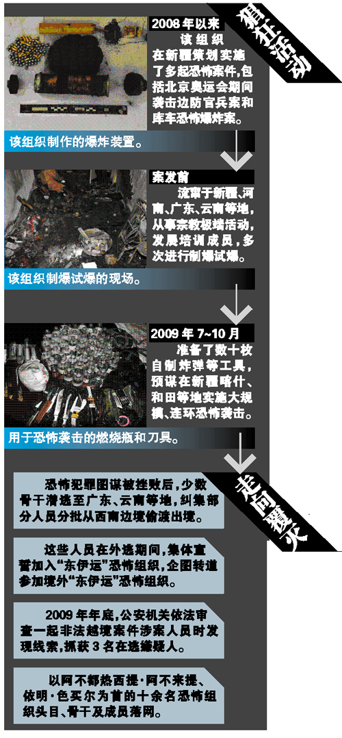 阿不都热西提·阿不来提、依明·色买尔等人在审讯中供认,案发前,他们流窜于新疆、河南、广东、云南等多个省区,暗中从事宗教极端活动,发展培训成员,建立恐怖组织,并积极筹措资金,四处寻购制爆原料,多次进行制爆试爆,为实施恐怖破坏活动做准备。为制造更大影响,2009年7月至10月,他们准备了数十枚自制炸弹、燃烧瓶以及刀斧等一批作案工具,预谋在新疆喀什、和田、阿克苏等地实施大规模、连环恐怖袭击。在其恐怖犯罪图谋被公安机关及时侦获并挫败后,该恐怖组织少数骨干成员潜逃至广东、云南等地,纠集部分人员分批从我国西南边境地区偷渡出境。这些人员在外逃期间,集体宣誓加入“东伊运”恐怖组织,并向“东伊运”恐怖组织头目的互联网邮箱发送照片等人员信息,索要具体出逃路线图,企图转道参加境外“东伊运”恐怖组织。公安机关现已掌握,这些人员在外逃过程中还得到了境外“东突”组织派人接应和资助。