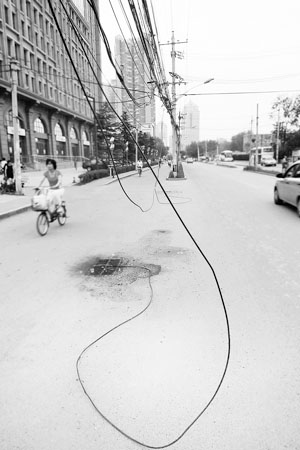 电缆垂在路中央,行人车辆难通行。