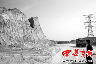 它周围的黄土几乎都被铲平了,只剩下它孤零零地矗立,墓体已完全暴露,有10米左右高。脚下就是即将穿墓而过的西铜高速公路路基。