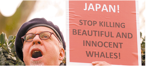 “日本,请停止捕杀美丽、无辜的鲸。”抗议者高举的标语如此写道。