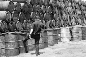 昨日,在黑加工点发现有几百只盛“地沟油”的铁桶■本组图片由本报记者 贾民 摄