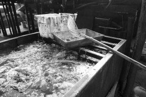 熬油的男子身后放置着大量的铁桶,旁边还有12个露天的水泥池子,里面可以看到鱼刺、辣椒末以及类似于骨头的东西。记者在熬油的大棚内仅待了半分钟,就感觉到极度的恶心,大棚里由于熬油太多地太脏,记者的鞋险些被粘掉。