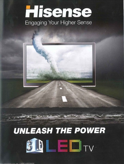借世界杯之机,海信在南非首家发布3D产品,启动口号为Unleash the power“释放能量”,统一采用飓风形象进行宣传,在南非知名电子类杂志DIGITAL LIFE上刊登了海信“释放能量”3D电视飓风形象广告,并针对3D电视展开深入广泛的市场宣传和高端展厅重点展示。