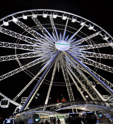 2010年FIFA世界杯之际,若你有幸能够站在南非的土地上,那你一定不会错过紧邻开普敦“绿点”足球赛场的高达50米的地标性建筑——海信摩天轮。南非世界杯海信摩天轮被命名为“Hisense Wheel of Excellence”,共有36个豪华观光车厢,内配有海信最新款LED液晶电视,将循环播放新华社关于世界杯足球赛况的高清视频报道,登上摩天轮即可以俯瞰开普敦全城的美丽风光和世界杯“绿点”足球赛场。