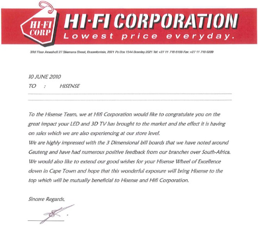 海信一系列的品牌宣传活动后,海信南非经销商HIFI公司特意给海信发来贺信,贺信中称海信LED和3D电视展示、3D立体广告牌以及摩天轮冠名等一系列品牌建设给HIFI公司带来了极大的震撼,海信在品牌建设上所做的努力,更增强了HIFI的信心,表示期待与海信进行更深入的合作。