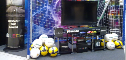 世界杯的热情点燃了南非,也带动了南非的消费热潮,尤其是带动了电视消费的新一波高峰。同时,来自世界各地的游人在尽享世界杯的精品赛事之余,也将shopping当做了体验南非风土人情的重要方式。海信借助这一时机,选择EASTGATE和ALBERTON两大南非著名的shopping mall作为形象展示窗口,以球门为背景,并将印有Hisense logo的足球摆放在产品周围,营造出足球赛场的氛围,醒目而有吸引力。