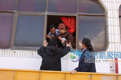 在救援过程中,铲车发挥了巨大作用,图为铲车在楼房前接一名老太太