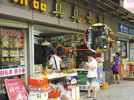 深圳友谊路一家士多里售卖吸毒工具冰壶。红圈处标出的位置是货架上的冰壶。记者 王磊 摄