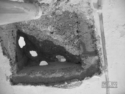 昨天下午,记者来到现场时,404的业主已经停止了装修行为。记者看到,张先生家卫生间的天花板被钻透了四个孔,每个孔都有茶杯口大小。张先生拿起两块手掌大的混泥土块,气愤地说:“这是4天前他们钻孔后,天花板松动掉下来的。幸好当时没人,如果人被砸到的话,后果不堪设想。”