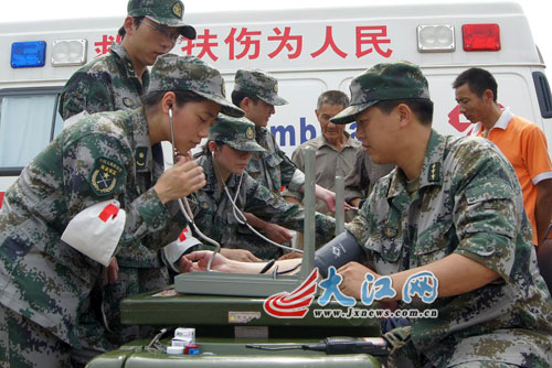 6月27日,唱凯大堤决口逐渐合龙,罗针镇道路上的洪水也退去,吴剑锋与学院官兵一起清理道路淤泥,蒋玉婷则随医院在灾区设置的医疗服务点为过往的官兵和群众服务。上午9时许,吴剑锋带几名群众来寻求医疗救助时,他的出现让蒋玉婷十分兴奋。“你来了。”打过招呼后蒋玉婷关切地问起丈夫的身体,并为他量了量血压。10分钟不到,吴剑锋就接到新任务不得不离去。在执行新任务的路上,吴剑锋的手机响了,“剑锋,照顾好自己,为了灾区人民,我们两口子一起努力!”妻子在短信中说。