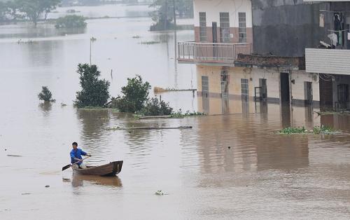 6月25日,在江西抚州重灾区罗针镇,居民坐船出行。6月24日8时至6月25日8时,江西抚河上游流域平均降雨量达57毫米。受此次降雨影响,抚河唱凯堤决口堤内水位出现逆退上涨,到6月25日8时,水位已涨至35.86米,与6月24日12时最低水位35.24米相比,上涨了0.62米,因此也造成了重灾区罗针镇二次被淹。新华社记者 金良快 摄