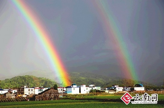 27日19时许,记者采访途经勐海县城,这时一场暴雨刚过,夕阳下的勐海城郊突然惊现两道直入苍穹的斑斓彩虹,引得行人纷纷驻足欣赏。