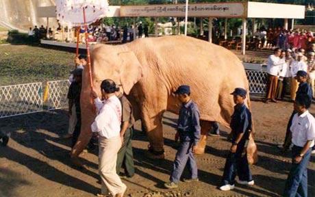 《缅甸新光报》称,该头大象是雌象,大约38岁,身高7英尺4英寸(约合2.23米),上周在西部沿海城市孟都被当地官员捕获。这头大象被描绘成雪白色,但其实它稍微有点灰色和棕红色。缅甸历代国王和领袖传统上都非常珍视白象,它们的出现亦往往被视为政治变革或好运到来的预兆。