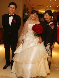 前“总统府秘书长”叶菊兰(右)5日嫁女儿,女儿郑竹梅(中)与女婿吕扬生(左)在婚宴前合影留念