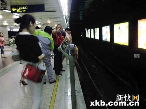 记者随后赶到现场,地上还有斑斑血迹,警方正在勘察,地铁工作人员则拿着杆子捞起一只落在铁轨上的女鞋。