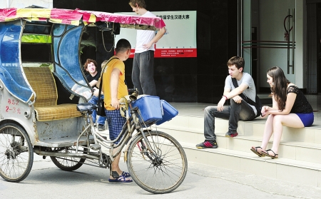 最近,在川大学生中开始流传一名三轮车师傅的故事:他年纪不轻,背微驼,看见留学生总要热情说“Hello(你好)”,常常站在留学生宿舍门口,向留学生请教某个单词怎么读。