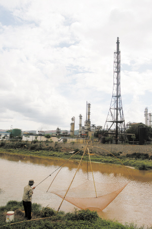 开远,市民在工厂旁的江边捕鱼时说:“如今一网拉起来连只虾都很难见到。”记者张韩/摄