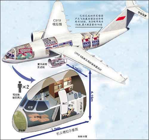 《汉和亚洲防务》杂志5月刊援引中国航空工业消息人士的话报道称,国产C919飞机计划于2014年开始飞行试验,2016年向订购方供货,但是客机设计项目并没有结束,中国还计划在其基础上制造200吨级军事运输机,在其研制和生产上,中国航空工业非常期望能够得到乌克兰的支持。