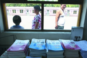 | 桌上摆着还未发放的暑假作业。昨日,海淀区苗苗小学的学生家长,为学校拆迁后学生安置问题,前往教委咨询。本报记者 浦峰 摄 |