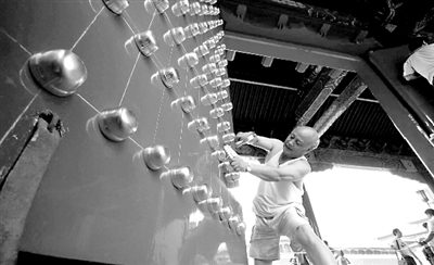 昨天下午,一名工人在给阙左门安装铜质鎏金门钉。据现场施工的负责人介绍,这次将对端门、阙左门和阙右门共11扇大门的1782个门钉进行重新安装,每个门钉都是全铜材质,进过镀金处理,重约3斤,将比以往没有镀金的门钉更加耐磨。由于游客经常抚摸门钉,因此有不少大门的门钉都有损毁缺失,以往总是临时用木质门钉先补上,而此次则是进行整体更换。本报记者 张沫 陈婷 摄影报道