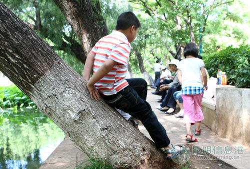 在翠湖公园一位游小朋友爬上公园绿化树,既不安全又不文雅。记者王俊星摄