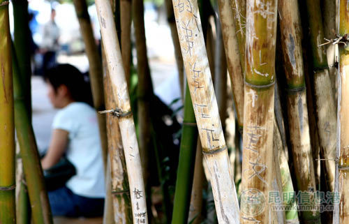 翠湖里的绿化植物上被游客刻满了字。记者王俊星摄