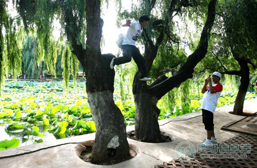 翠湖公园内,一些游客不讲文明攀爬树木。记者王俊星摄