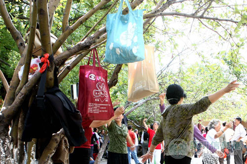 翠湖里的绿化树上挂满了包,绿化植物不堪重负。记者王俊星摄