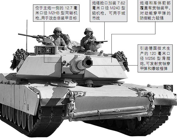 M1A1坦克长约10米,高2.4米,重63吨,装备一门120毫米口径滑膛炮和一挺12.7毫米口径同轴机枪,主要装备美国陆军和海军陆战队。美国的盟友科威特、沙特阿拉伯、埃及和澳大利亚也装备有这种坦克。(何西)