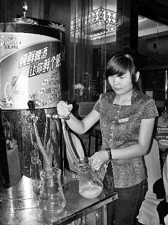 尊皇大酒店工作人员在为顾客接啤酒。见习记者 曹剑 摄