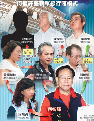 何智辉与高院法官蔡光治是多年好友,何智辉的秘书谢燕贞和蔡光治的女友黄赖瑞珍更是20多年前幼教工作的同事;板桥地检署主任检察官邱茂荣则因曾在苗栗地检署做过主任检察官,与当过苗栗县长的何智辉早已熟识。何智辉于是运用两个女人当中间人,再利用司法官之间同学、同事情谊,各自对承审法官行贿。