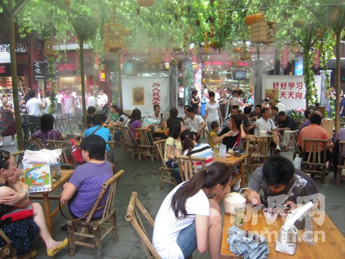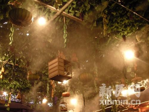 记者看到,郁郁葱葱的葡萄藤架下挂满瓜果、串串竹笼中此起彼伏的蝈蝈在鸣叫,悬挂的鸟笼中还有真的画眉。葡萄藤下安装了定时喷雾装置,让棚内凉爽异常。游客们休憩于竹椅上,轻摇蒲扇,看老式放映机放黑白老片,听青褂长衫说书人,笑侃旧上海风云变幻,偶尔还有一位提着大茶壶的茶艺师前来一展功夫茶艺。
