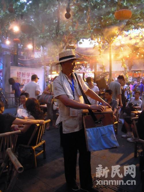 新民网记者在现场看到,今年的夜市以“纳凉”为主题,中心广场上还原了一条上海老弄堂,游客在弄堂口的黑板报上就能看到用粉笔写下的当天纳凉活动。弄堂周边,井水冰西瓜,逗蟋蟀比高低,下军棋论输赢,上海人过去的种种纳凉方式被做成雕塑供中外游客欣赏。老上海流动小贩也出现了,敲着醒木向路人兜售冷饮的、捏面人的、卖蝈蝈的、制香袋的,一溜地摊旁顾客频频光顾。