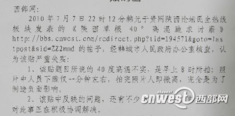 一周后的7月14日早上,韩城市人民政府办公室给西部网发来一封百字左右的“函”,称网帖“严重失实”。理由是“照片是早上8点拍的,气温没40℃”、“他们下跪仅一分钟”、“反映的问题不少与事实不符”。