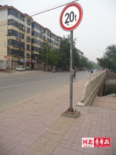 在东岗路南侧的民心河桥上,顺着行进盲道行至桥头西侧时,为了绕开便道上的路灯杆与绿化树,行进盲道改为提示盲道,提醒盲人前方路况有变化。可就在两段盲道交界处,却出现了一个“限重20吨”的指示牌。
