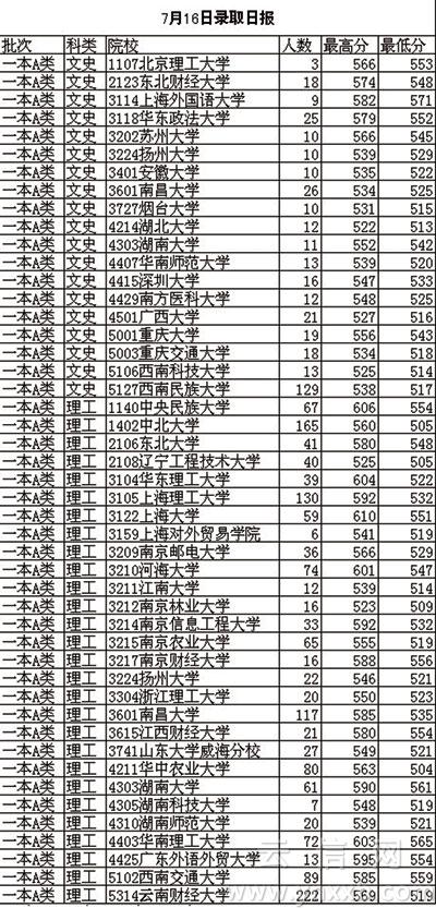 昨晚,省招生考试院继续公布一本A类院校录取情况。在文史类方面,西南民族大学成为录取最多考生的院校,录取129人,最高分为538分,最低分为517分。在理工类方面,中央民族大学、华东理工大学、上海大学、河海大学、华南理工大学均有600分以上考生被录取。而云南财大的最低录取分数线更是超过多所省外院校,甚至包括一些“211”院校。