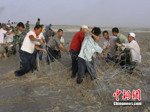 | 团场干部职工在洪水中扎防洪铁丝笼加固二级电站防洪坝。作 者:黄斌 |