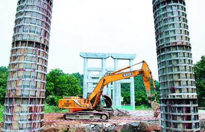 武广片区的配套设施施工现场,施工人员正冒着烈日赶进度。根据武广片区控制性详细规划,长沙南站正好位于京广和杭长纵横两条高速铁路专线的交会点,而且杭长高速铁路专线将向西延伸至昆明。两条纵贯南北、横穿东西的高铁动脉,在中国南部版图上形成了一个耀眼的十字交叉中心,长沙恰在这中心上,而随着武广、沪昆铁路在长沙版图内划出一个高铁“黄金十字”,长沙将成为中南地区铁路客运中心。贺文兵 摄