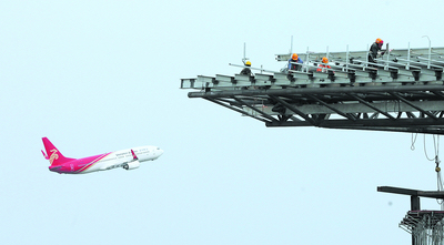 日前,一架起飞的航班正从建设中的长沙黄花机场新航站楼一角飞过。湖南省目前单体建筑面积最大的钢桁架结构的第三代航站楼——长沙黄花机场新航站楼建设目前工程主体完工,由前端主楼、中间连廊、空侧三个半岛式候机厅等部分组成的新航站楼已现雏形。工程全面进入屋面施工和装饰装修施工阶段,竣工后,能满足2015年高峰小时旅客吞吐量3940人次的需求。将来,黄花机场将在现有一条跑道的基础上再增建三条跑道、两座新航站楼。从现在年11万架次的起降到2020年的26万架次,这将真正“让长沙飞向世界,请世界飞到长沙”。余志雄 摄