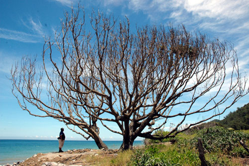 据报道,发现老树危机的是桃源小学校长郑汉文,日前他到南田海边了解核废料未来贮置场地理环境,吃惊发现两株相依百年的琼崖海棠老树,各有大半边枯萎,根部被大浪淘空,伫立在海边的夫妻树仿佛随时要“分手”。