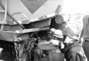 “我们到现场时汽油仍在不停地泄漏,很危险。稍有一点火星,油罐车必然爆炸。”马驹桥消防中队队员称,他们赶至现场后发现,两事故车辆已经“镶嵌”在一起了。由于无法判断泄漏点,所以没有轻易挪动车辆。消防队员用水枪不停喷射两辆车,才将两车分开。随后对泄漏点及周围稀释,并在车辆周围设起警戒线。