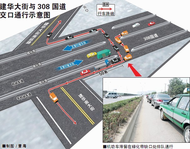 然而,昨日上午记者来到建华南大街与308国道交口时,却发现这个十字路口被308国道南北三排绿化带隔断成“丁字路口”。从建华南大街南行至此的车辆纷纷左拐逆行或右拐从慢车道找出口,或干脆原路返回。