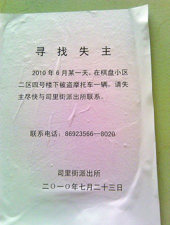 找回被盗车却怎么也联系不到失主 民警无奈,小区张贴招领启事