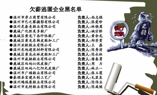 “黑名单”上,温州巴之黎摄影公司负责人张爱珍因经营不善,变卖公司资产后一走了之,公司39名员工18.5万元血汗钱打了水漂;鹿城区双屿沁悦皮鞋厂因经营亏损,鞋厂负责人周力欠薪逃匿,该区劳动部门启用“欠薪应急周转金”,帮助员工解决暂时生活困难,并通过法律援助向法院起诉,法院拍卖企业财产全额支付了91人的18.6万元工资……
