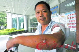 现年50岁的陈伟南是云东海街道旧四村村小组长。记者昨日下午在三水人民医院见到陈伟南时,其全身上下血迹斑斑,左胳膊上的两处刀伤已经缠上白纱布,其左小臂上还有长达数厘米的刀痕并未处理,最严重的是右臀部的伤口深达1.5厘米。