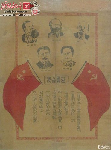 记者看到,这件“入党誓词”高约50厘米、宽约30厘米,整幅誓词的底面为土黄色,整体保存完好。誓词最上端为马克思、恩格斯、列宁、斯大林和毛泽东五位伟人的头像,两侧各有一面印有镰刀、斧头、五角星的党旗,下端写有当时的共产党员入党誓词。誓词最下端印有“赵县县委翻印”字样。