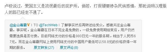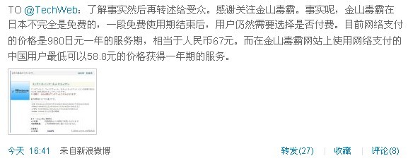 报道一出,业界引起哗然。金山公司在7月29日发表微博对此事做出了解释,而此种解释又很难让人信服。金山公司称:金山毒霸在日本不完全是免费的,一段免费使用期结束后,用户仍然需要选择是否付费。目前网络支付的价格是980日元一年的服务期,相当于人民币67元。而在金山毒霸网站上使用网络支付的中国用户最低可以58.8元的价格获得一年期的服务。